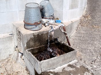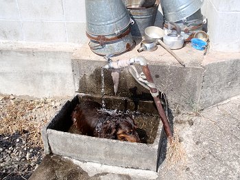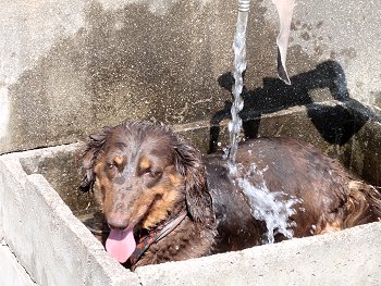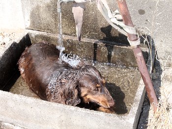でも、胴長短足のゴンchanですから、一気の駆け上がりの方が楽なのでしょうねぇ〜石段を駆け上がり我が家のお墓近くにヤッて来ますと何ヶ所か水くみ場がありますから、サッサと先行し待機のゴンchan。