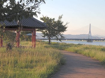 挿入の画像は、市営プール横のウォーキングロードから芦田川大橋の主塔方向を撮りましたものなんですけど、何となく景観も秋らしくなって来ました。
