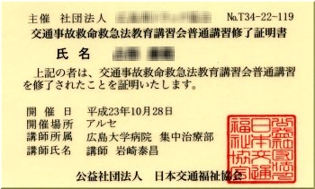 この講習会を受講しますと「講習終了証明書」を貰いますけど、何故か裏面には「本証明書は、受講日より3年間有効です」との記載が(^-^)この証明書が何の役に立ちますのか…この証明書がありませんと、AEDの使用が出来ないのか…いぇいぇ、決してそうではありません。基本的にはAEDは誰でも簡単に使用・操作出来ますから別に証明書がなくてもイィような…