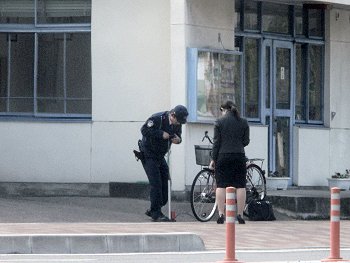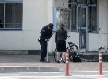赤信号で暫し停止のGONsan、ヒマに任せて周辺を見廻しておりまして眼に入りましたこの光景。社用で自転車で出かけましたOLsan、途中で空気が抜けましたのかも…