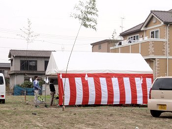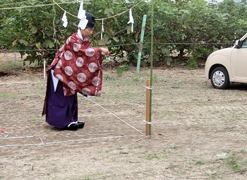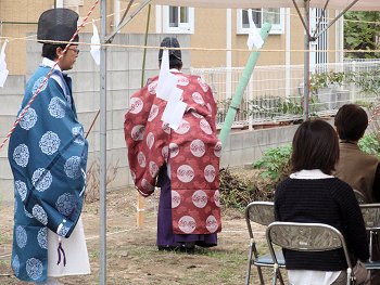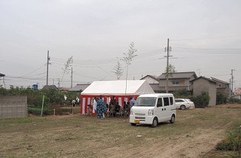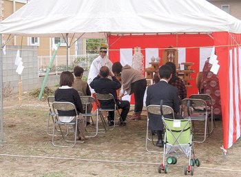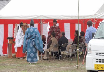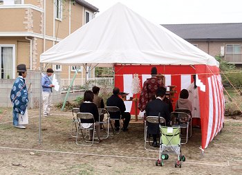 11/3(木)で大安吉日のこの日、文化の日でもありましたからGONsanも暫し見学させて頂きました。と言うよりも勝手に写真を撮らせて頂きましたのですけど(^-^)■地鎮祭地鎮祭(じちんさい・とこ しずめ の まつり)は、土木工事や建築などで工事を始める前に行う、その土地の神(氏神)を鎮め、土地を利用させてもらうことの許しを得る。これには神式と仏式がある。一般には、神を祀って工事の無事を祈る儀式と認識されており、安全祈願祭と呼ばれることもある。鎮地祭、土祭り、地祭り、地祝いとも言う。一般には、土地の四隅に青竹を立て、その間を注連縄で囲って祭場となし、斎主たる神職のもと、建築業者・施主の参列の上で執り行う。祭場の中には木の台(八脚台という)を並べ、その中央に神籬(ひもろぎ、大榊に御幣・木綿を付けた物で、これに神を呼ぶ)を立てて祭壇となし、酒・水・米・塩・野菜・魚等の供え物を供える。また、関西などの特定の地方によっては伊勢神宮近隣の浜から砂または塩を取り寄せ、四隅に置く場合もある。祭壇の左右に、緑・黄・赤・白・青の五色絹の幟に榊をつけた「真榊」を立てる場合もある。この五色絹は五行説における天地万物を組成している5つの要素、つまり木・火・土・金・水を表している。◆地鎮祭とは◎地鎮祭とは、土木工事を行う際や建物を建てる際に、神様に工事の無事や安全と建物や家の繁栄を祈る儀式のことを言います。「じちんさい」と読むほか「とこしづめのまつり」と読むこともあります。建物を建てる土地や、土木工事をする土地の氏神様の神主をお招きして地鎮祭をとりおこないます。お供え物をし、祝詞をあげ、お払いをして浄め、施主が初めてその土地に鍬(くわ)や鋤(すき)を入れます。起工式と同時に行われる場合もあります。◎もともとはその土地の氏神様を祀っている神社が地鎮祭をしていましたが、近年では氏神、産土神、鎮守の神が同一視されるようになってきており、最も近い場所にある神社に依頼することが多くなってきています。◎地鎮祭の日取り…地鎮祭は慣例的には吉日を選んで行なわれることが多いようです。地鎮祭の吉日とされるのは、大安、先勝(または友引)の日です。儀式は、暦を見て大安または先勝(または友引)の日を選び、午前中に行います。手配や準備は施工会社に依頼するのが一般的です。出席するのは、施主、施工会社、工事関係者、神職です。WEB上で検索致しますと、こんな記載がありましたけど、施主様にとられましては誠におめでとうございますです(^_^)v7〜8年前までは、我が家周辺には住居が散在の状況でしたけど、ここ近年は土地を手放されたり子供さんがマイホーム建設等で、ボツボツと住宅が増えて来ましたネ。