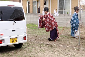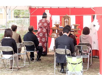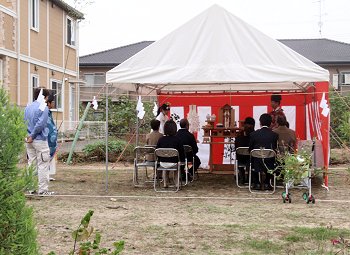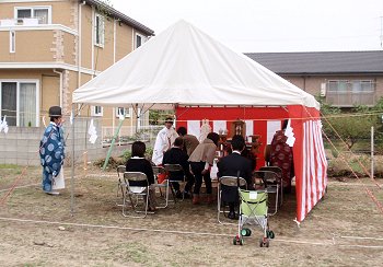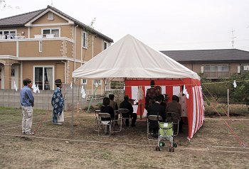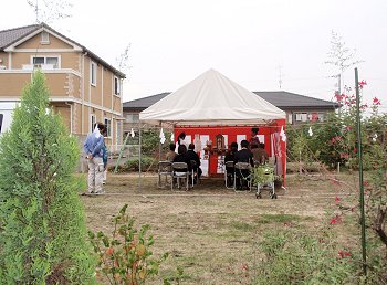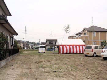 四区画に宅地分譲されまして、さっそく四軒のお宅が住居新築の運びとなりました(^.-)☆で、最初に地鎮祭を執り行われましたのがこのお宅。