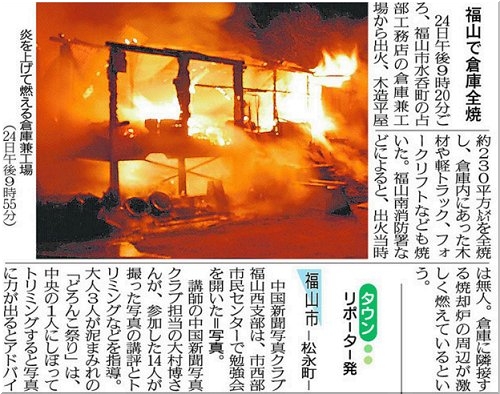 で、知らせて頂きましたのが正午前頃でしたか…電話連絡を頂き、「建設会社の資材置場の火災だけど、詳細は分からない」との事でありました。人災の有無が気になりましたけど、今朝の中国新聞に一日遅れでこんな記事の掲載がありました。