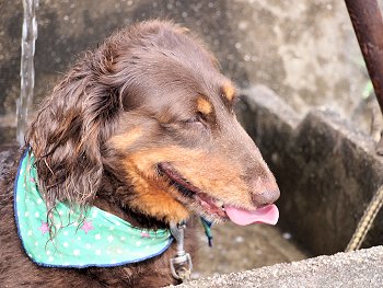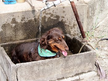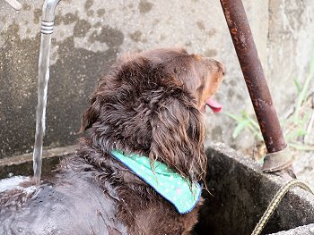 そんなに元気があるのなら、初めからサッサと歩いてくれれば…と。我が家のお墓近くの水汲み場が近付きますと、もぅたまらないように駆け足のゴンchanで、サッサと蛇口の下で待機です。