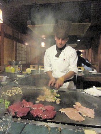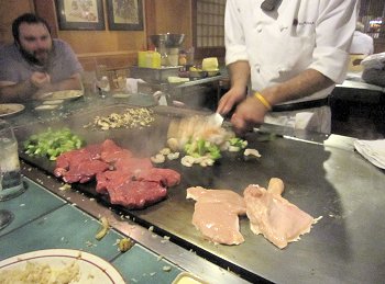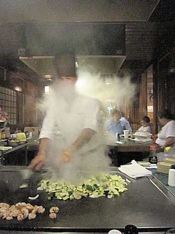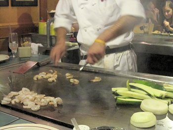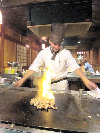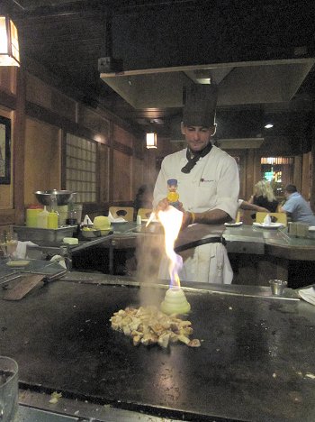で、このHibachiですが、鉄板を囲って席につくと、シェフがちょこちょこパフォーマンスしながら焼いてくれます。