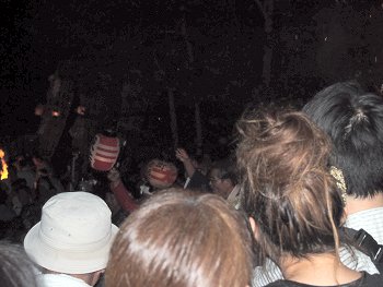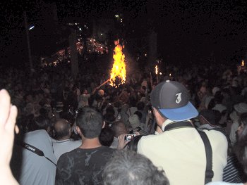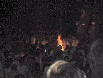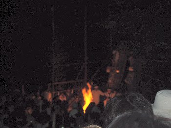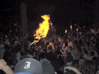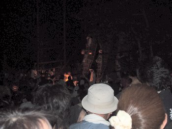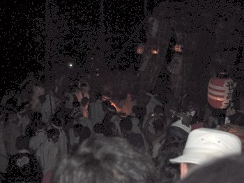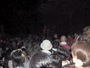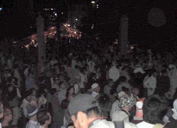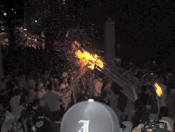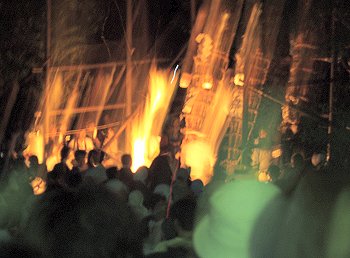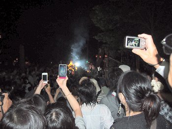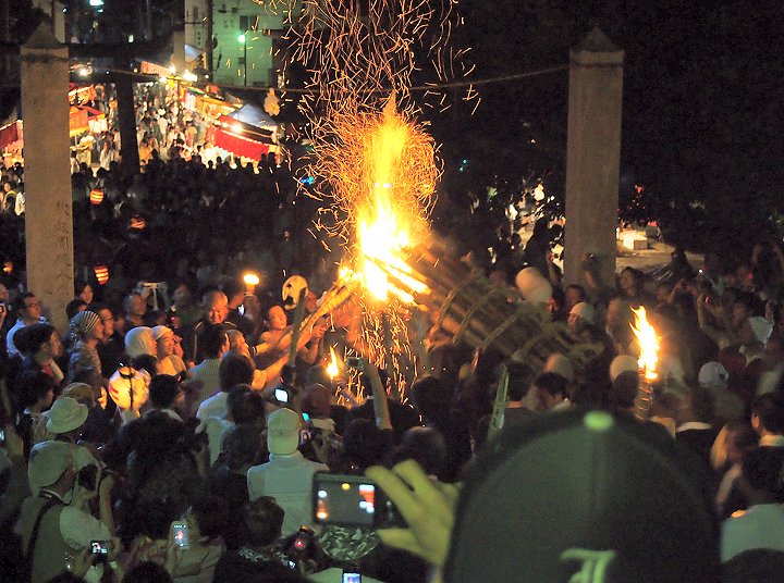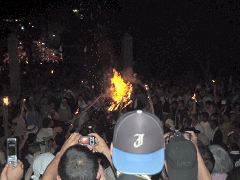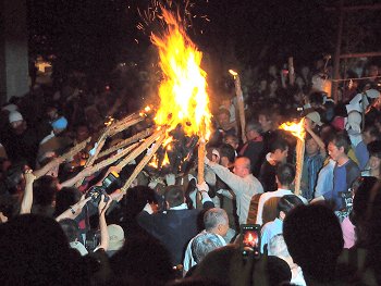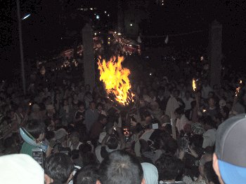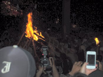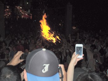 白装束の祭事運営委員の神前手火の松明に神火が移されると、白装束の一団が眼にも止まらぬ速さで一気に駆け抜け随身門前南側に安置されている大手火(大松明)への神火移しの儀に向かいます。