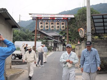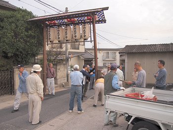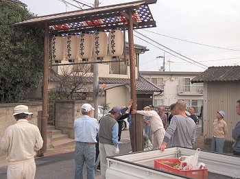 その準備で、土曜日はA.M.6:00に集会所に集合。集会所に隣接の吉廣神社に掲げられました御神燈を取り外し、八幡神社参道の我が町内の所定の位置に移設です。