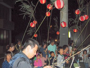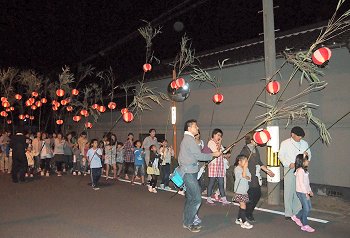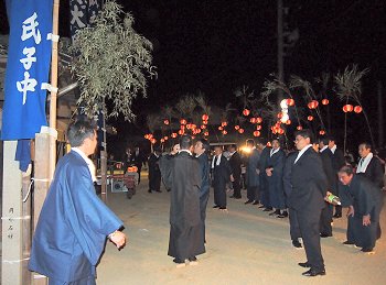 子供会の皆様が手にしています紅提灯に眼を向けていますと、何となく秋祭りらしく盛り上がって来ましたよ(^_^)vまずは、吉廣神社・財之木神社に礼拝後、いよいよ八幡神社にと出発です(^-^)//"