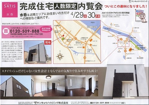一昨日でしたか…折り込みチラシを整理しておりましたら、我が家近くの新築物件の「完成住宅内覧会」に眼が止まりました(^.-)☆