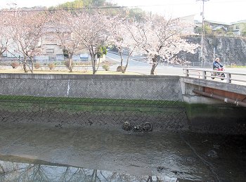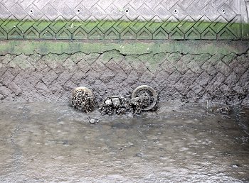 勝手知ったる我が道とばかりアッチで道草、そしてコッチで道草…と好き勝手に歩いておりましたが(^-^)水呑川に眼を移しますと廃棄されましたバイクが泥まみれで存在しておりました。