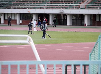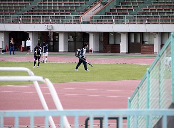 まぁそのような事はさて置きまして、陸上競技場内では芝生のフィールドの清掃中。