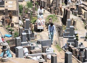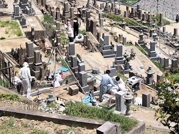 墓石の設置も狭い通路の中、大変ですネ…