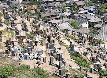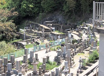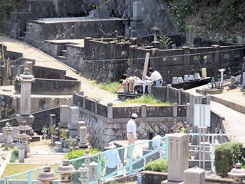 山の斜面に存在します墓地で、通路も狭く石段も部分的にありますから業者の方々も大変です。