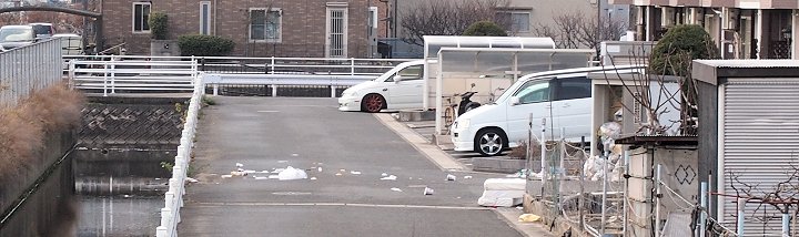 さて、何を撮ろうか…と見廻しますと、お正月でご不在のお宅なのでしょうか…家の前の道路上にゴミが散乱でありました。