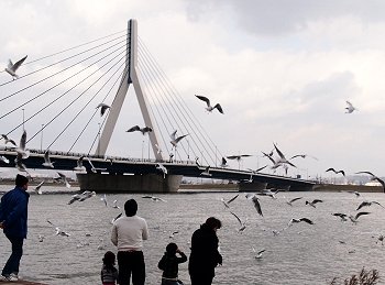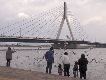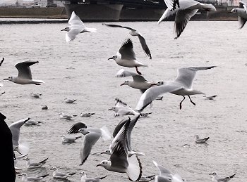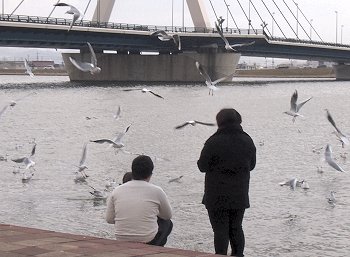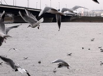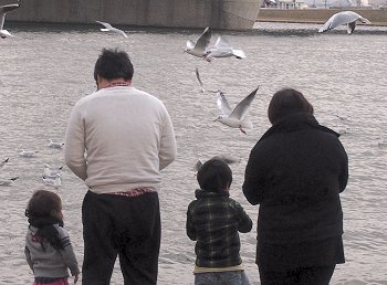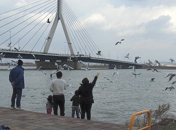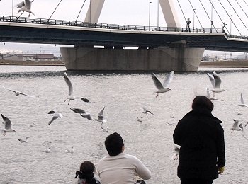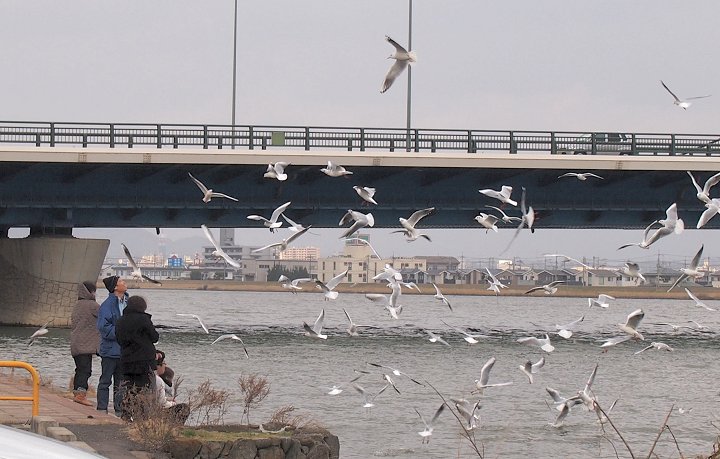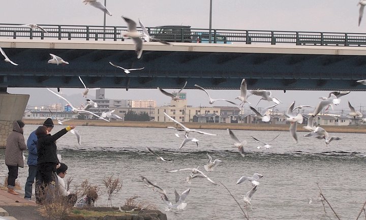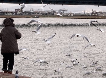 そして、芦田川大橋下へと向かいますと、河岸ではご家族連れがカモメの群れに餌与えの真っ最中でありました。