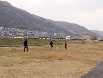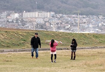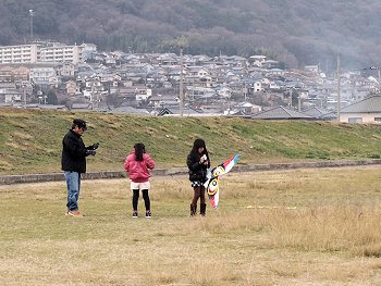 レーシングカートとお別れし芦田川大橋下をくぐり抜けますと、今度は凧揚げを楽しんでおられますご家族を暫し拝見となりました(^.-)☆