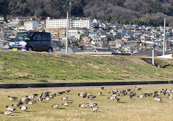 河川敷では、カモsan達が温かい日差しの下で穏やかに過ごしておりました。こんなカモsanを眼に入れ、チャリンコの籠から降りたそうなゴンchanです。が、降ろそうものなら。カモsan達は一斉に飛び立ってしまいますから、降ろす訳にもいきません。