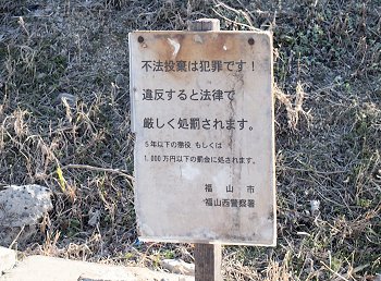 そして、すぐ脇には「不法投棄は犯罪です!違反すると法律で厳しく罰せられます。5年以下の懲役もしくは1,000万円以下の罰金に処されます。--- 福山市・福山西警察署 ---」の立て看板が(^.-)☆それにしましても、どなたがここに不法投棄をされましたのでしょうねぇ〜
