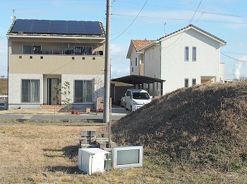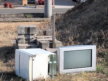 GONsanもゴンchanも、こんなカモsan達を横目に通過となりました。河川敷から土手に上がり、そしてまた下り、我が家方向にと向かっておりますと、農地脇の一角にテレビ・冷蔵庫・ブロック等が放置されておりました(^-^;
