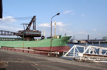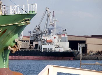 とは言いましても、いつもと変わり映えしません景観なんではありますが…でも、今年初めての福山港の景観ですから、何となく清々しい気持ちもしてしまいます(^.-)☆岸壁には、「くつわ」のマーク入りの貨物船『しんこう』が停泊中。