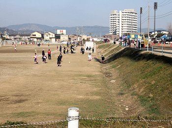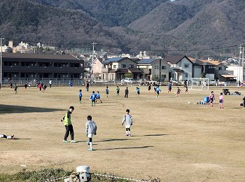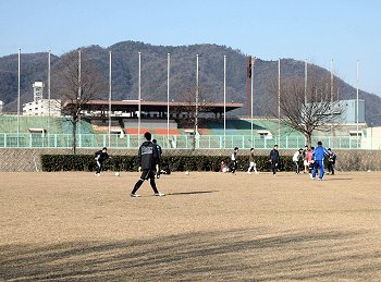 ノラsanあがりのゴンchanですから、あっちでムシャムシャ、コッチでムシャムシャ。本当に美味しそうに草を食べながらの歩行ですから、チョッと恥ずかしい気持ちがしない事も(^-^;多分、雑草と言えども新芽の草は美味しいのかも分かりませんねぇ〜場所によっては座り込んで食べておりますから…多目的広場では、小学生の皆様が元気にサッカーを楽しんでおられます。