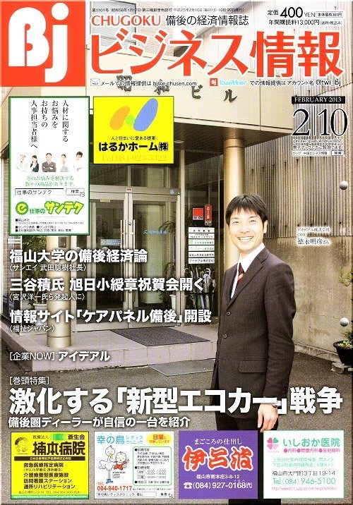 本日、何気なく地元の経済情報誌「ビジネス情報」を手にしましたら、なんと、福山の有名人・Tsanが表紙ですから、う〜ん、スゴイのGONsanでした(^.-)☆Tsanとは、ご縁ありまして昨年の12月から職場を同じくして勤務しておりますGONsanなんであります(^.-)☆