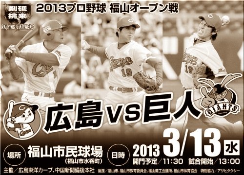 せっかく立派な環境も整いましたというのに、優勝とは無縁。実に哀しい広島県民であります。是非とも、今年こそ優勝を!!ところで、来月の13日(水)は福山市民球場で「広島×巨人」のオープン戦。