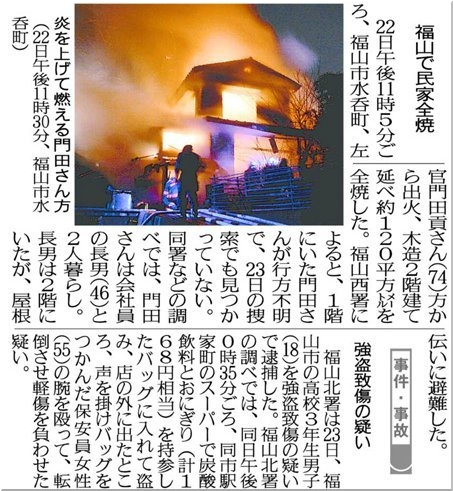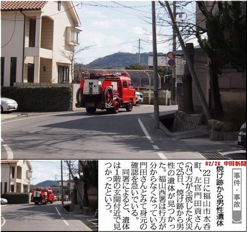 消防車が火災現場方面に向かっていますと言う事は、この日もまだ捜索中であったのかも分かりませんネ…それが、今朝の新聞のこんな記事に眼が止まってしまいました。挿入の画像の中国新聞sanの記事なんですけど…