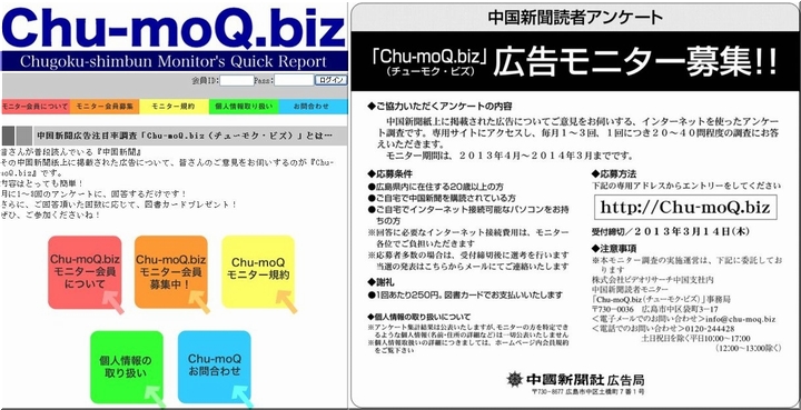 額的には少額ですけど、1年間のモニターへのご協力で年間3,000円程度…ですが、広告モニターもチト面白そうではありますネ(^_^)v…と言う訳で、とりあえずGONsanも応募です。申し込み手続きを終えますと、早速、こんなメールが届いておりました。この度は、中国新聞読者モニター「Chu-moQ.biz(チューモク・ビズ)」へのお申し込みをありがとうございます。