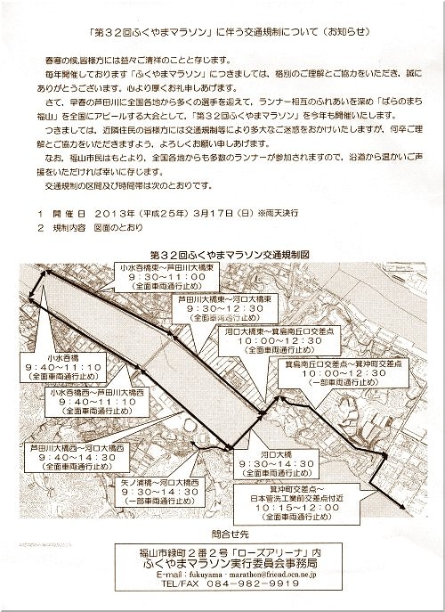 今夜、勤務を終え我が家にと戻って来ますと、食卓の上に3/17(日)開催の「第32回ふくやまマラソン」交通規制の案内が無造作に置かれてありました。