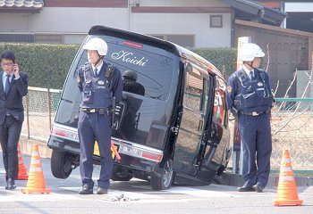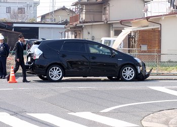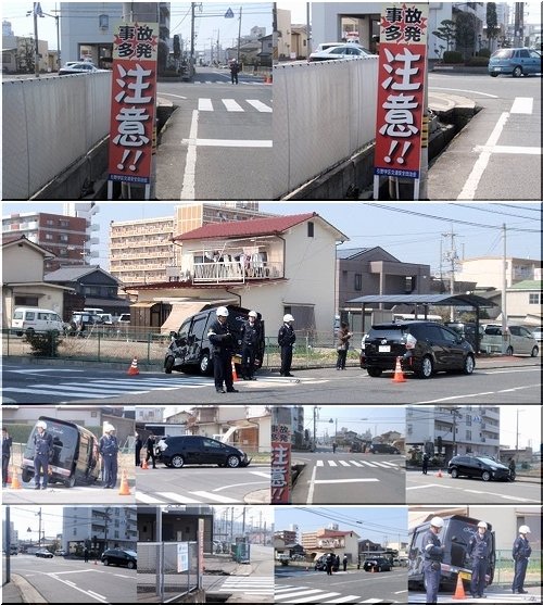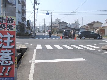 それにしましても、こぅして現場に駆け付けますと「何でこんなに同じような衝突事故が多発するのだろう?…」と実に不思議。『事故多発 注意!!』の立て看板の表示はありますし、決して大きな交差点でもありませんで見通しは良いのですけど、何故か本当に似たような事故が多発の交差点。この6年余りで、この場所で何度似通った事故場面を画像に納めた事でしょう…写真展の開催でも出来るくらいの画像を撮っています…と言いましても決して過言ではないのですけどネ(^-^)