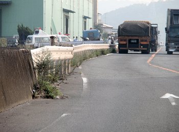 入江大橋方向から箕沖方面に走行します場合に、突然、分離帯らしき縁石が続きますから、直進しますと宜しいのですけど、わざわざこの縁石の左側に入り、縁石左側の倉庫脇の側道を走行されます方が時たまおられますようですネ(^-^)