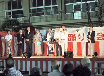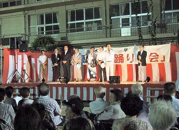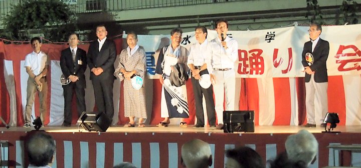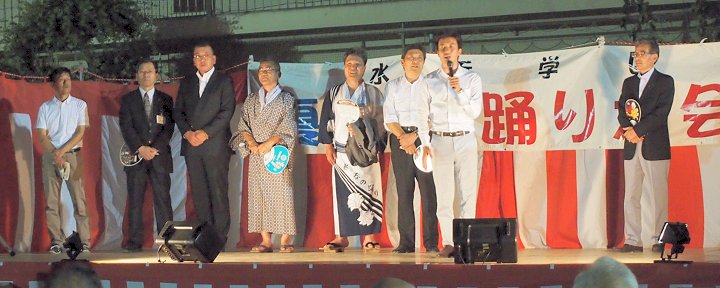 檀上の皆様をご紹介致しますと、ステージに向かって右から、羽田市長・小林代議士・宇田県議・熊谷市議・塚本市議・福山商業高校校長・向ヶ丘中学校校長の皆様です。こんな面々が揃われますのは、水呑ならではかも分かりませんねぇ〜福商の校長先生はダンスパフォーマンスの方にも出られましたご様子。