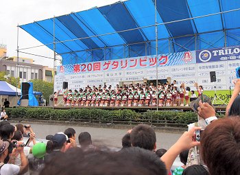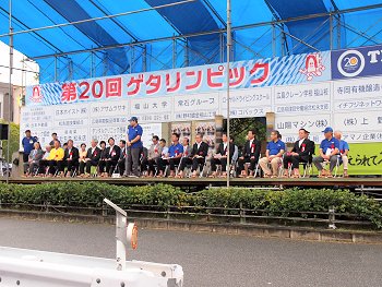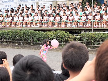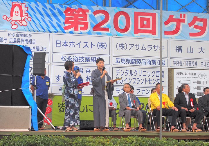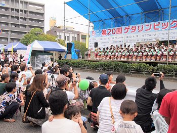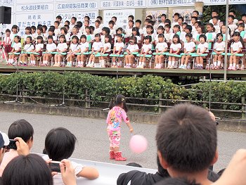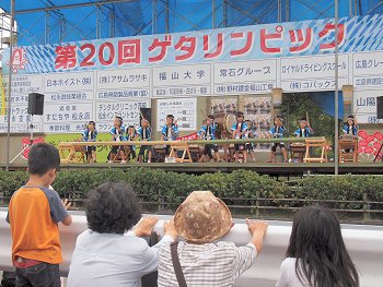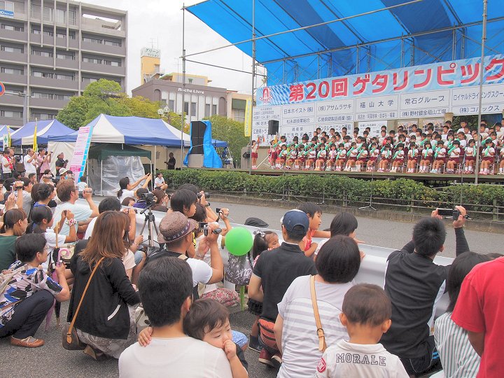 司会は、GONsanの職場で毎日お顔を合わせます「あーくん」sanでありました(^.-)☆羽田市長のご挨拶、来賓の方々のご紹介、ゲタリンガールズ紹介、下駄デザイン入賞者表彰…と続きまして、開会式後のオープニングセレモニーのトップは松永幼稚園年長組の皆様の「メロディオン鼓隊」でありました。