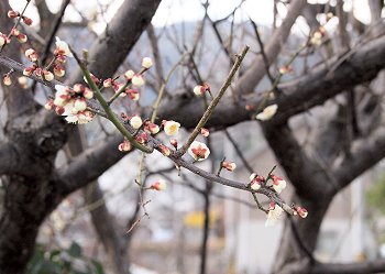 ゴンchanを連れてきても良かったかな…と、少々悔やまれたりもしてしまいます。(墓地に上がりますと結構風がありまして、そんなに温かいばかりでもなかったのですけど…)今回は、これまた久し振りに、墓地までの道中をノンビリと眼に入ります景観を画像に納めながらの墓参りとなりました(^.-)☆出掛けます前に、まずは熊ヶ峰方向をパチリ。そして、今から向かいます墓地を。そして、いざ出発ですが、近くの畑の片隅に梅の開花が眼に入りましたから、それもパチリ(^_^)v