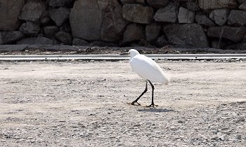 私達が近付いて行きますと屋根の上から舞い降りて来まして、この空き地を歩きます。大概いつもこんな調子ですから、多分、同じシラサギなんでしょうネ(^-^)カメラを向けまして眼が合いますと、また飛び立って行くのですけど、警戒心は強いのでしょうねぇ〜