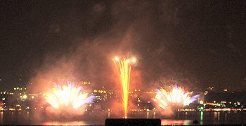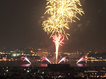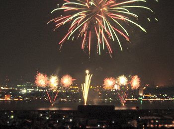 会話の内容から、3人の内1人が水呑の方で、あとの二人は友達で花火見物に招かれましたのかも分かりませんねぇ〜定刻P.M.7:30丁度に開始となりまして、まずは大会挨拶が続きます。