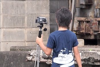 三脚にビデオカメラを取り付け足早に急ぎます小学生が…