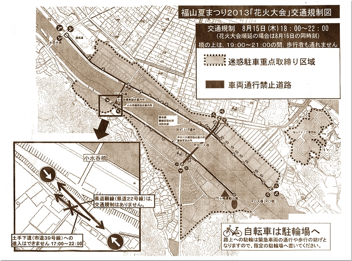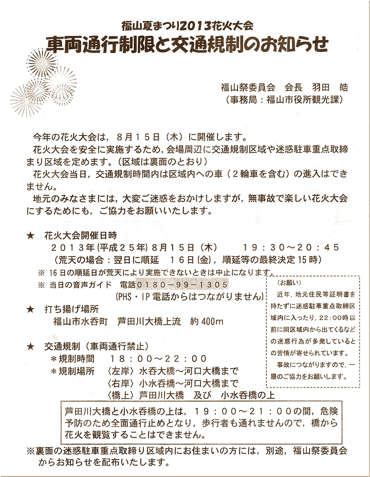 とにかく、何処で画像に納めようか…と悩んでしまいます。まぁそれは良いのですけど、先日また「福山夏まつり2013花火大会」の車輌交通制限と交通規制のお知らせが郵便受けに投入されておりました(^.-)☆