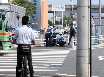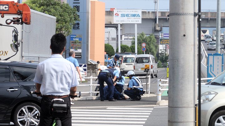 白カッターの男性の真ん前にヘルメットのお巡りさんがお一人。