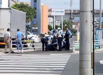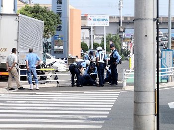 友人特派員からの一報が、「トラックの運転手はガタガタ震えていた…」との事ですから、歩道でうずくまっておられる男性がウィング車の乗務員さんなのでしょうねぇ〜