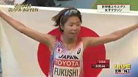 陸上の第14回世界選手権は10日、モスクワのルジニキ競技場で開幕し、最初の決勝種目の女子マラソンで、福士加代子(ワコール)が日本に2大会ぶりにメダルをもたらした。30キロ手前で先頭集団から遅れ始めたが、そこから大きく失速せずに粘り通した。木崎良子(ダイハツ)も2時間31分28秒で4位入賞。野口みずき(シスメックス)は33キロ付近で棄権した。前回優勝のエドナ・キプラガト(ケニア)が2時間25分44秒で勝ち、この種目史上初の2連覇を果たした。