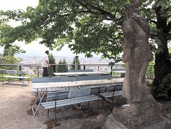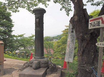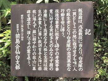 この場所からは会津若松市中心部が一望でき当時を思い起こすことが出来ます。案内板によると「戸ノ口原の戦に利あらず白虎隊士20名が西軍の追撃を受けながらやむなく戸ノ口洞穴をくぐり、この地に辿り着いた時は鶴ヶ城附近の侍屋敷が大火災を起し、天守閣は炎と黒煙に包まれており、主君のもとに馳せ帰るべき最後の望みを失われた。最早や落城は目前に迫る吾等君国に殉ずるはこの機なり、と全員遥かにお城に拝し従容として自刃し相果てた聖地である。」とあります。