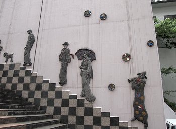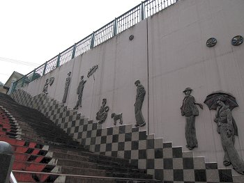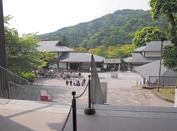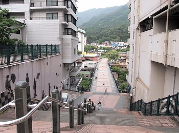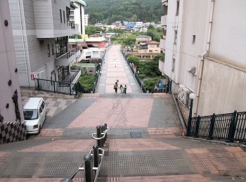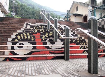 わずか10段の石段を実際以上に高く、遠く見せる遠近法を利用している。10段目、中央の敷石が「照降石」で、斜めに分かれた茶と青の色の違いが強まると、翌日から天気が崩れるそうだ。