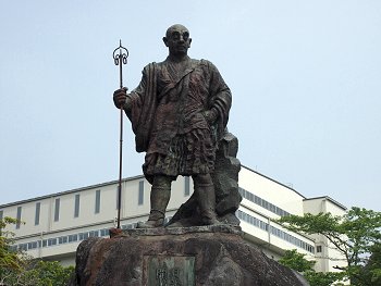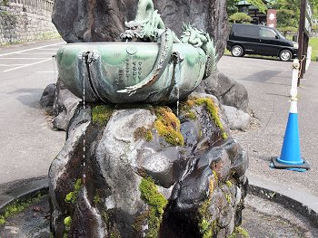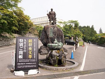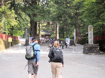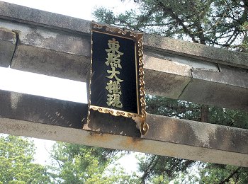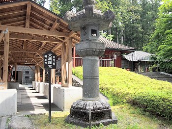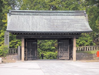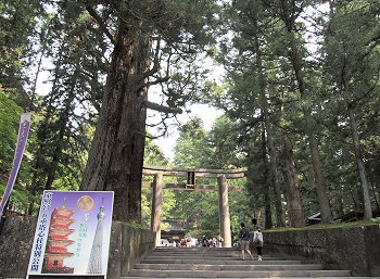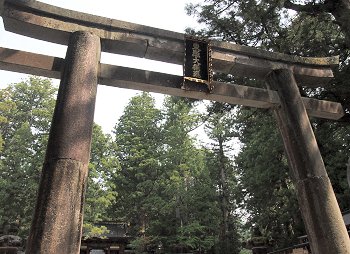 ◆石鳥居--いしどりい--黒田藩52万石の藩主、黒田筑前守--ちくぜんのかみ--長政が元和--げんな--4(1618)年に奉納した石造りの鳥居で、高さ9メートル、柱の太さ3.6メートル、柱の中心の間隔が6.8メートル。京都八坂神社、鎌倉八幡宮のものと合わせて日本三大石鳥居と呼ばれるが、江戸時代に建てられた石造りの鳥居としては日本最大。後水尾--ごみずのお--天皇が書いた「東照大権現」の額だけでも畳1枚分の大きさがある。