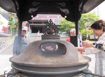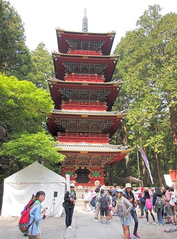 ◆五重塔・石鳥居の左手にある高さ約36メートルの五重塔若狭--わかさ--(福井県)の小浜--おばま-藩主、酒井忠勝の寄進で慶安--けいあん--3(1650)年に建立されたが、文化--ぶんか--12(1815)年に焼失し、3年後の文政--ぶんせい--元(1818)年に忠勝の子孫、忠進によって再建された。高さは約36メートル。内部は吹き抜けになっていて、中心を貫く直径60センチの心柱--しんばしら--が4層(4階)から鎖でつり下げられ、その最下部は礎石の穴の中で10センチほど浮いている。建物が揺れても重心は常に中心にあって倒壊を防ぐ耐震・耐風対策といわれる。