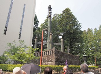 ◆相輪塔[日光山輪王寺]輪王寺三仏堂の後方にある、高さ13mの青銅製の供養塔。1643年(寛永20)、徳川3代将軍家光の命を受け、天海大僧正が比叡山の相輪塔にならって造立したといわれる。塔内には1,000部の経典を収蔵。4本の副柱に支えられた塔身には24個の金鈴と金瓔珞「ようらく」の装飾が施され、この鈴風にあたると、人間はもちろん鳥獣草木に至るまで仏の功徳を受けられるといわれる。