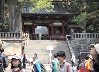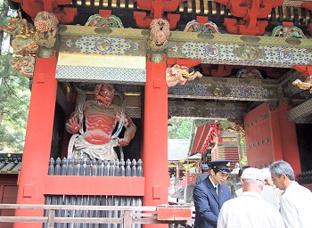 仁王は仏教の守り神。明治4(1871)年実施の神仏分離で、この仁王像は大猷院--たいゆういん--の仁王門に移された。それ以来、門の名称も表門と呼ばれるようになった。仁王像が戻ってきたのは明治30(1897)年。門の側面にいる唐獅子--からじし--や獏--ばく--、通路に面した麒麟--きりん--や虎--とら--など82の彫刻が施されている。裏面の虎のうち右から2頭目の体の模様が違う。縞--しま--ではなく丸、つまりヒョウであるが、江戸時代、ヒョウは虎の雌--めす--と思われていた。