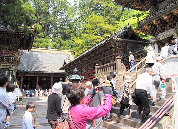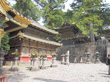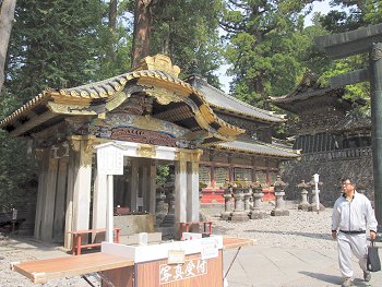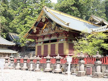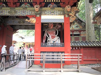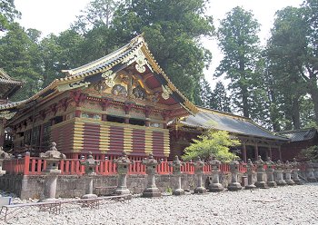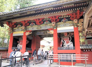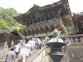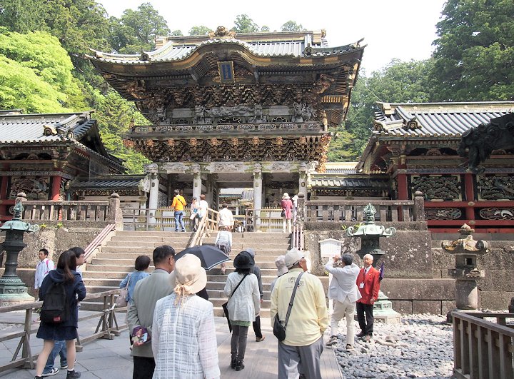 極彩色で装飾されている2層の楼門は、1日中見ていても見飽きないことから日暮門[ひぐらしもん]の異名をもつ。12本の円柱が支えるため十二脚門ともよばれる。