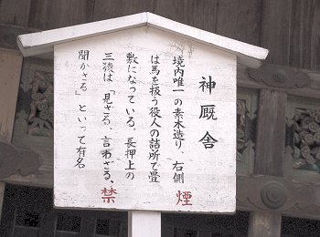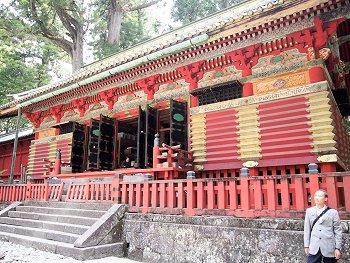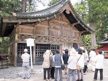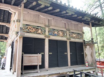 さんざる(みざる いわざる きかざる)東照宮境内、表門をくぐると左手に、神馬をつなぐ厩[うまや]・神厩舎[しんきゅうしゃ](重要文化財)が立つ。